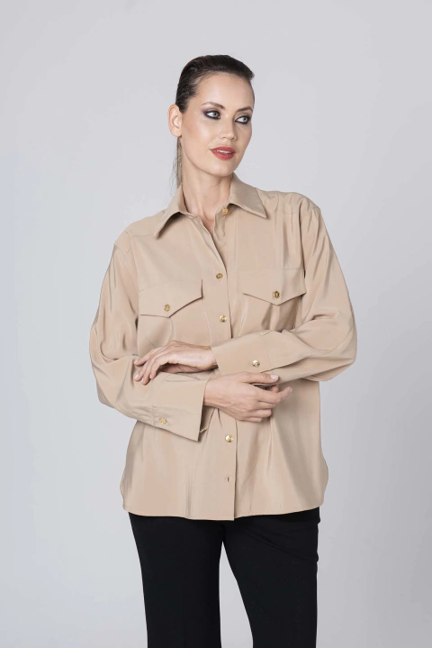Camisa en seda lavada con tajos a los costados. De cuerpo recto con bolsillos paque en el delantero.