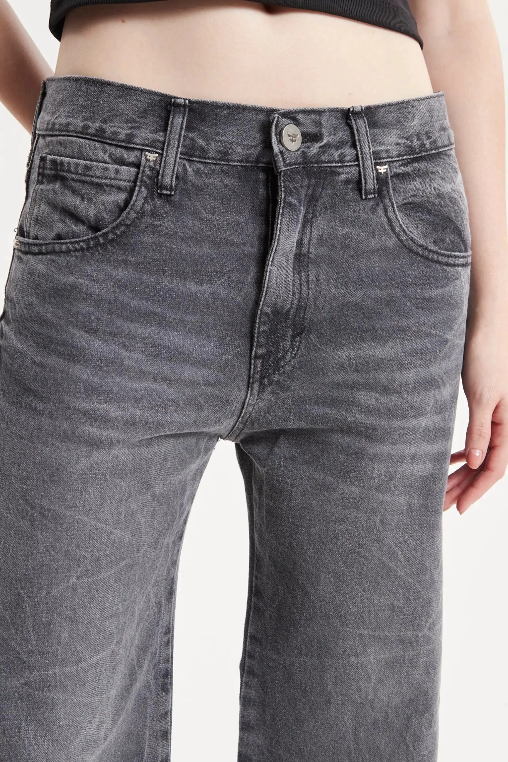 Jeans tiro bajo lavado gris con quebrados, wide, extra largo extendiendose por el calzado. 5 bolsillos.