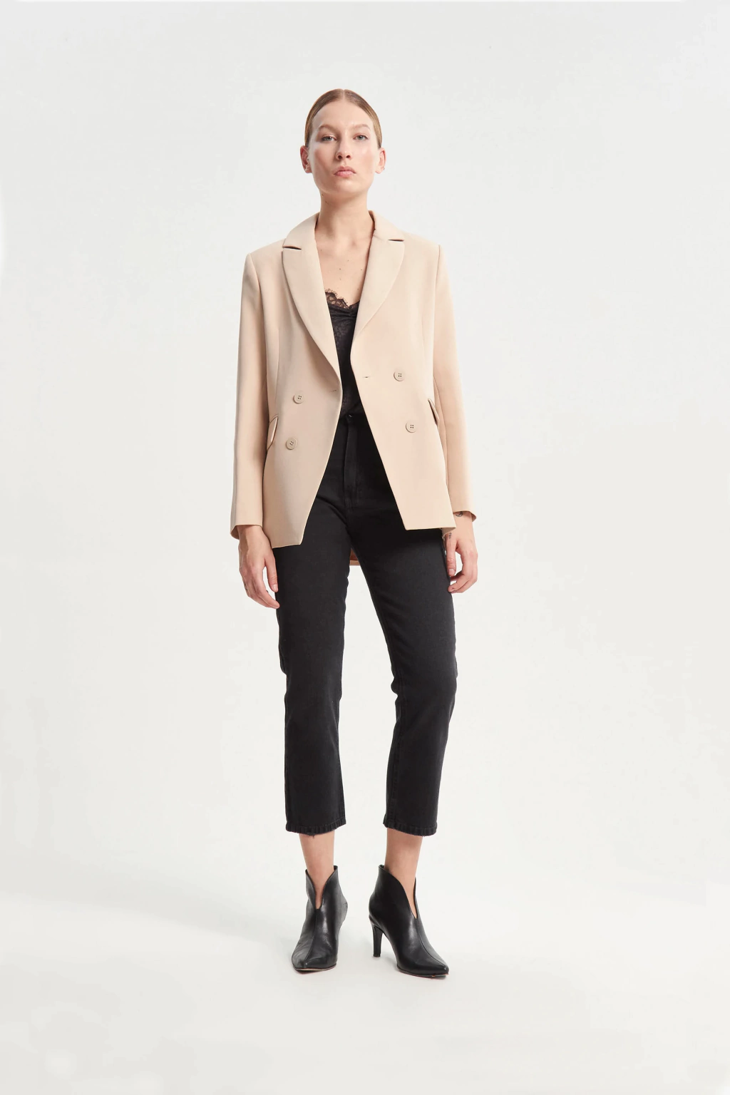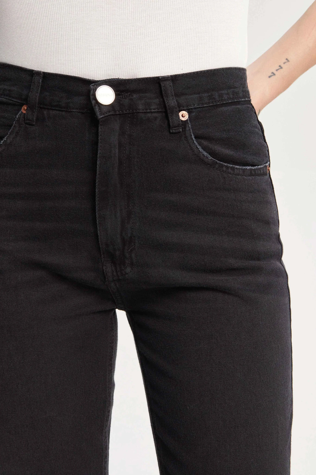 Jeans recto slim negro de tiro alto. Detalle de roturas ruedos de bolsillos. Largo cropped, arriba del tobillo. Para un calce más relajado sugiere un talle más. Referencia modelo: Altura 1,76. Talle pantalón: 26. Parte de arriba: S