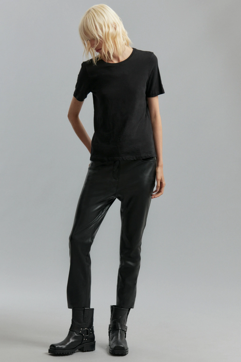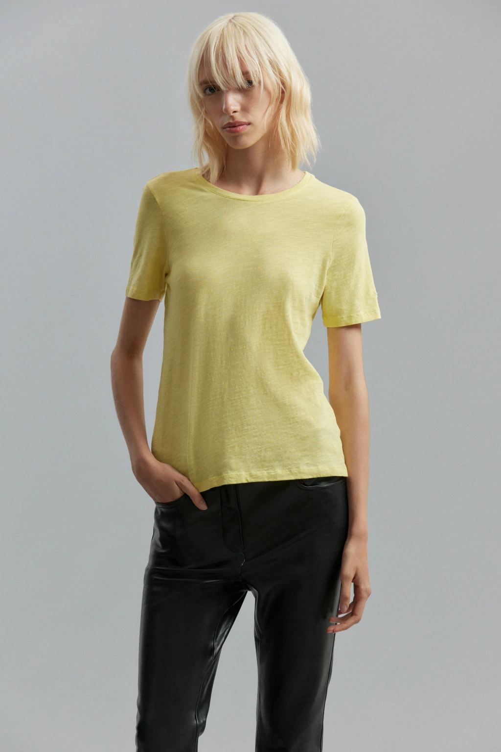 Remera manga corta con escote redondo, confeccionada en jersey flamé de algodón, una tela natural caracterizada por ser muy suave y cómoda. Pequeño bordado marcario logotipo centrado en la manga. Calce clásico. Referencia modelo: Altura 1,78 m. Talle de pantalón: 26. Parte de arriba: S.